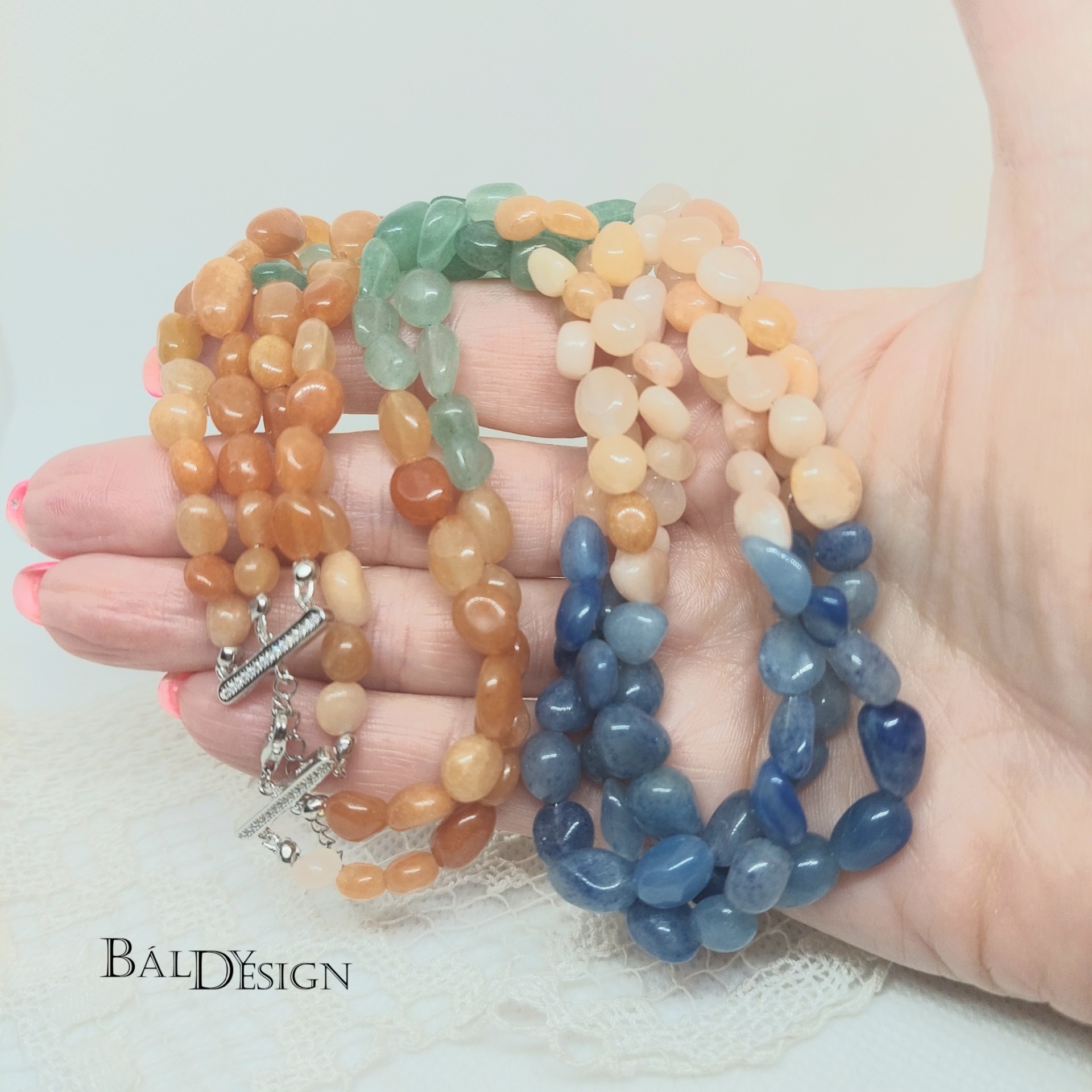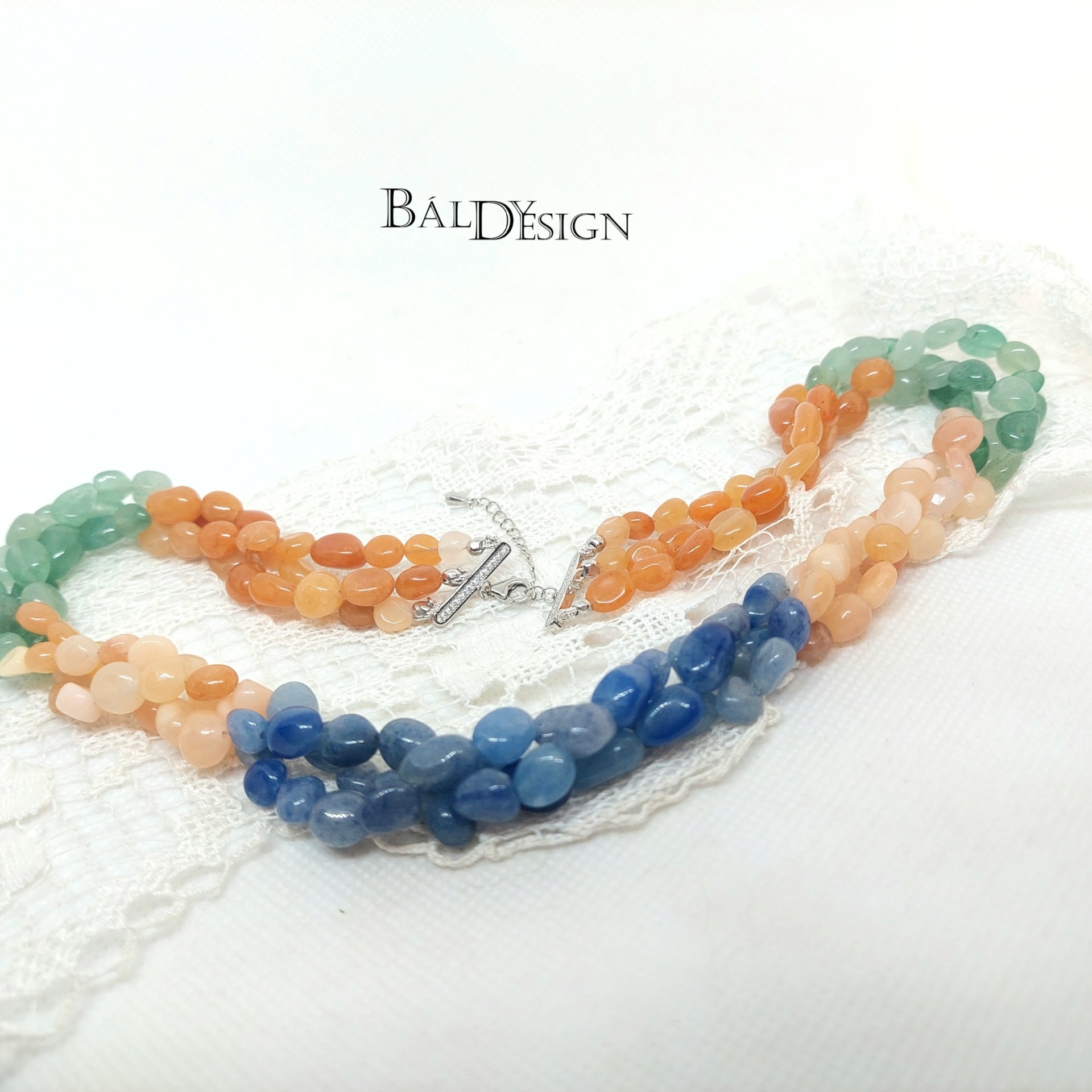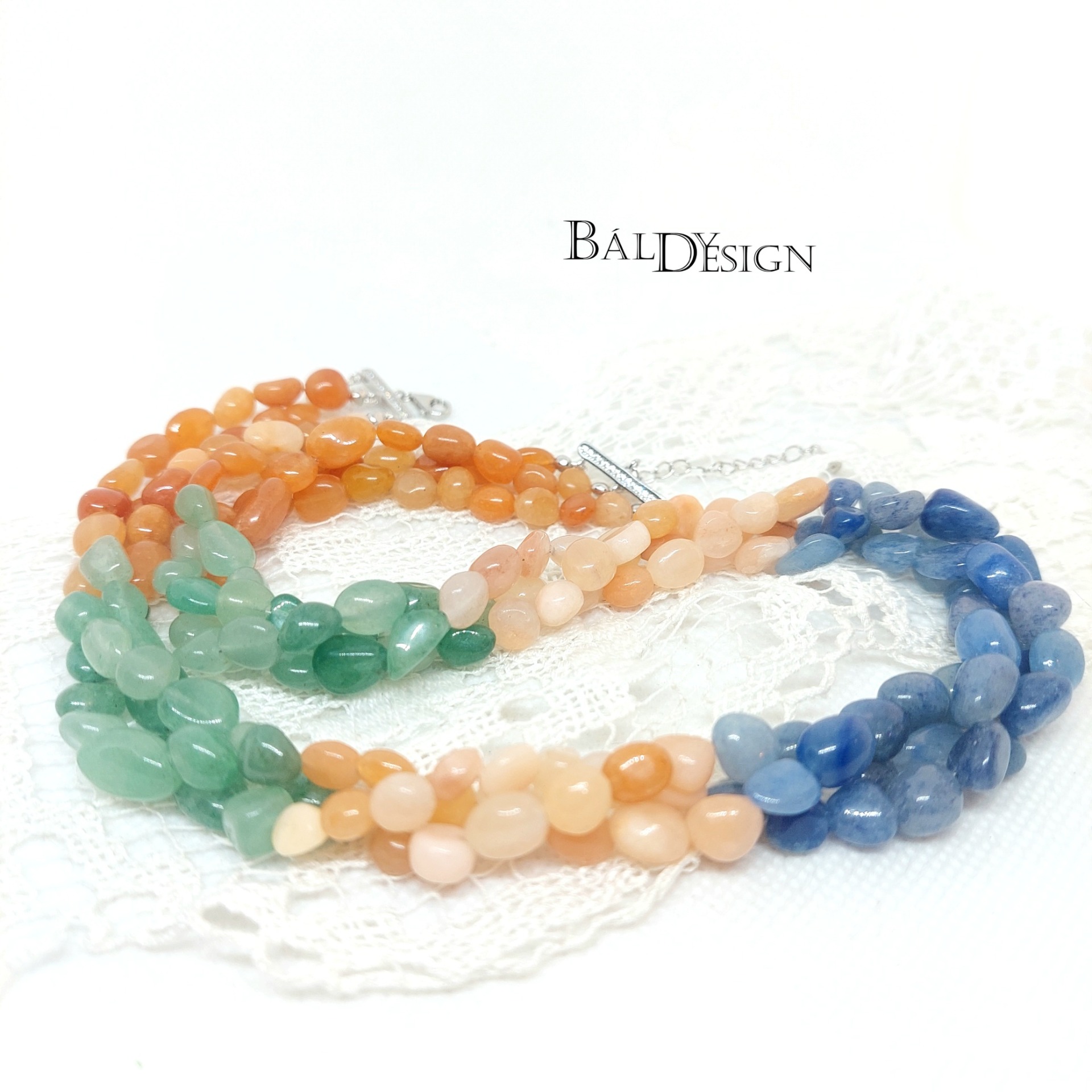 Varázsold a mindennapjaidba az ősz meleg színeit! Ez a gyönyörű, 3 soros aventurin ásvány nyaklánc az őszi falevelek pompáját idézi kék, zöld, bézs és barna árnyalataival. Az aventurin, más néven a "szerencsekő", a belső nyugalmat, optimizmust és bőséget vonzza életedbe.
