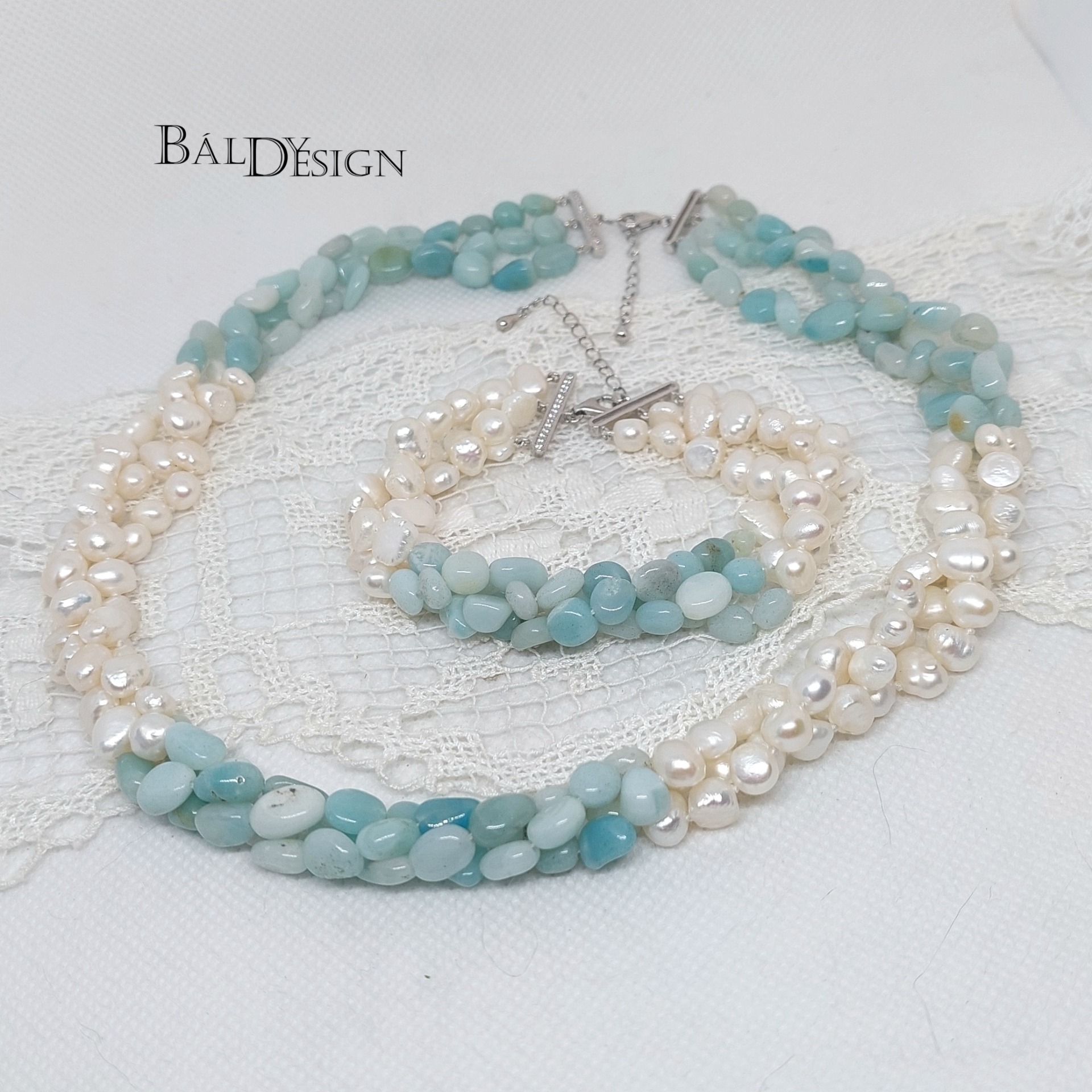 Az elegánsan összefonott nyaklánc és karkötő dekoratív kiegészítője minden megjelenésnek. Az amazonit világoskék színe és a fehér édesvízi tenyésztett gyöngyök tökéletes harmóniát alkotnak, kiemelve egyedi stílusát és eleganciáját. Legyen a középpontban ezzel a mutatós szettel, mely tökéletes kiegészítője mindennapi és alkalmi viseleteinek. Minden egyes szem között csomó van a biztonságos viselett miatt.