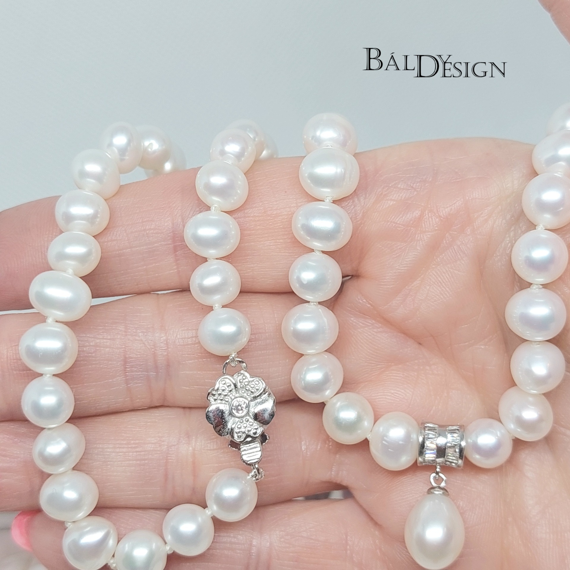 - Kiváló minőségű édesvízi gyöngyök: A gyöngysor gondosan válogatott, sima és fényes édesvízi gyöngyökből készült, melyek garantálják a tartósságot és a kifinomult megjelenést.