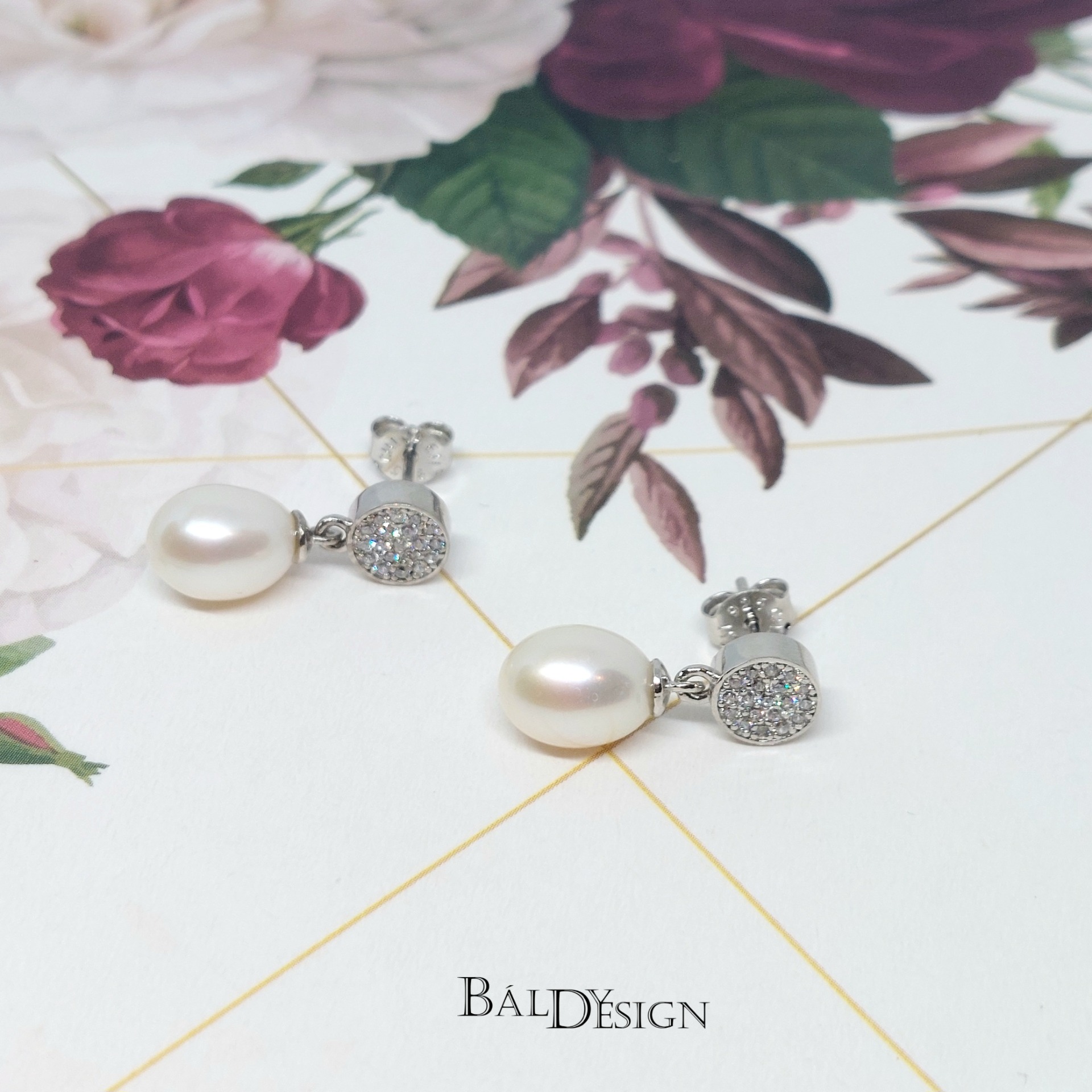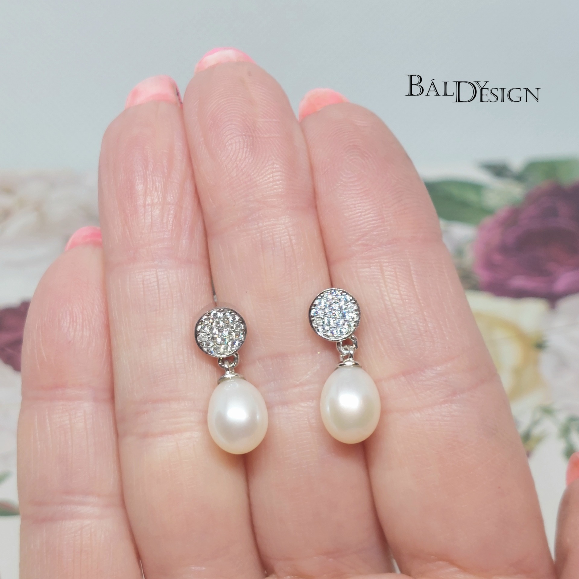 Elegáns ezüst csepp gyöngy fülbevaló – köves díszítéssel és valódi tenyésztett gyönggyel