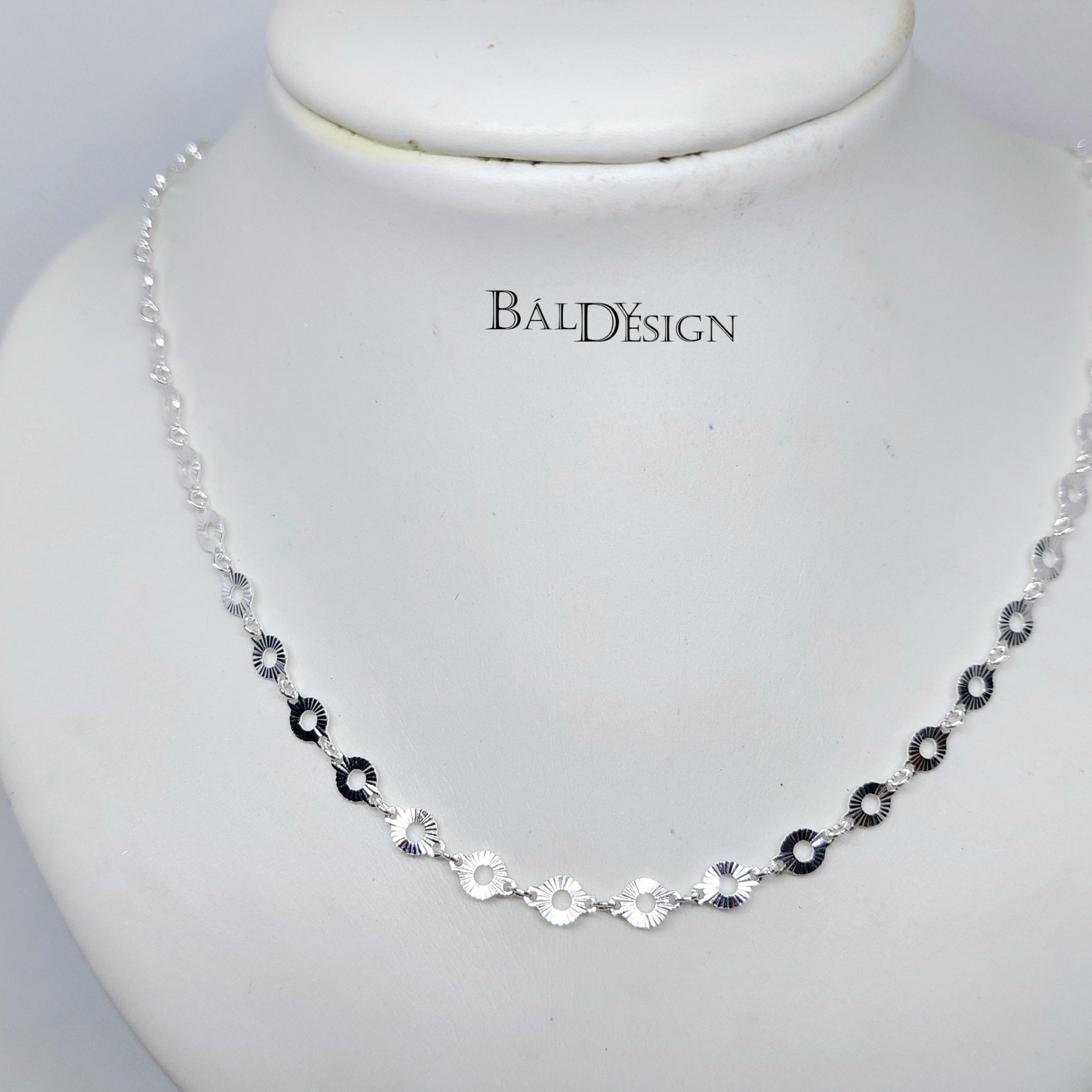 Fedezd fel az ezüst vésett mintájú nyaklánc letisztult, mégis látványos megjelenését! A gondosan kialakított, apró kerek lapocskák finoman csillognak minden mozdulatnál, így a nyaklánc egyszerre egyszerű és rendkívül mutatós. Modern stílusának köszönhetően tökéletes választás hétköznapi viselethez és különleges alkalmakhoz is.