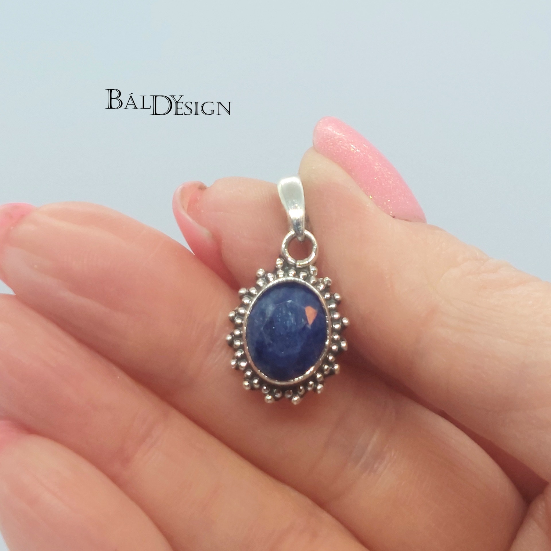Ezüst zafír medál – természetes zafír, ragyogó sötét kék fényben