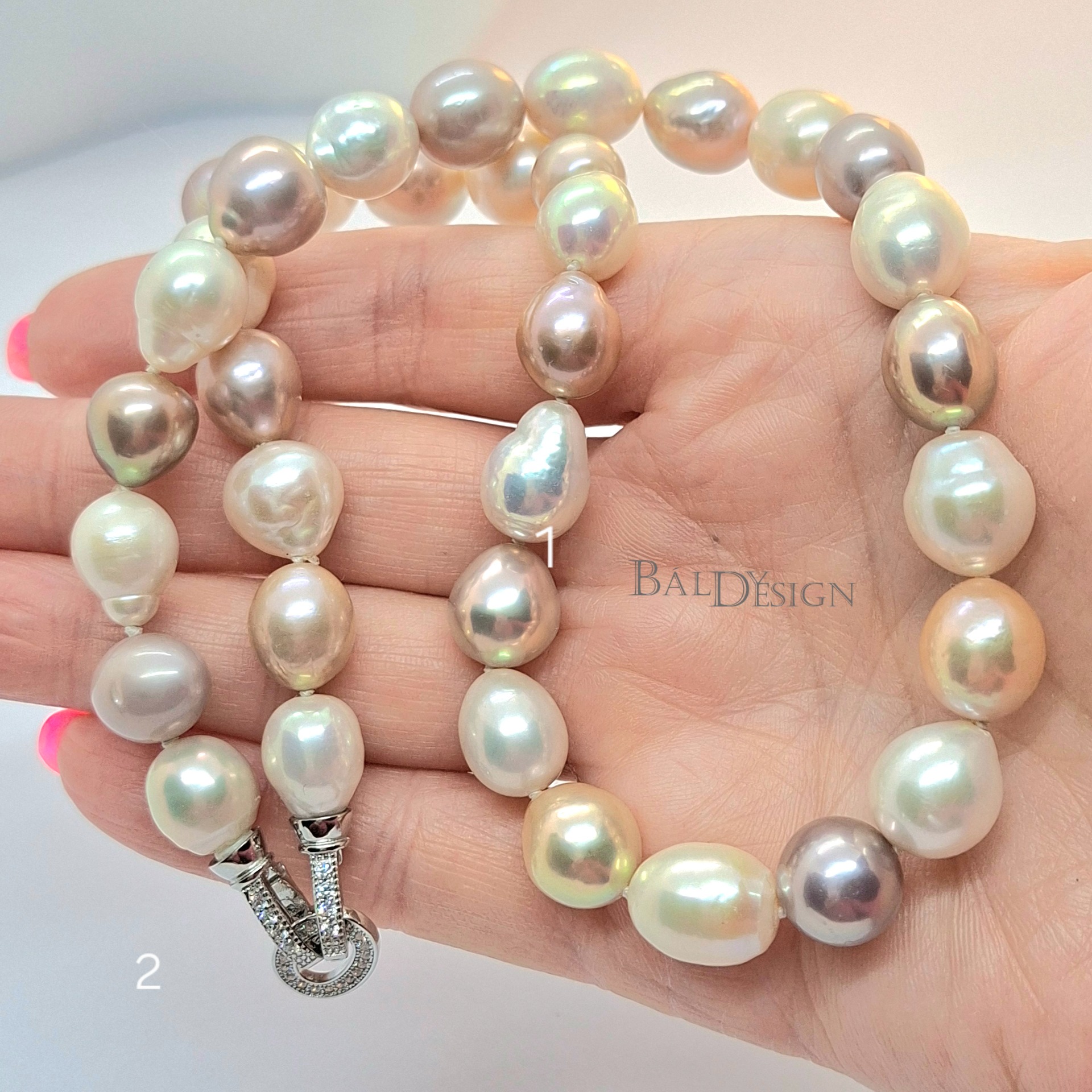 A gyöngysor egyediségét a három harmonizáló szín – a klasszikus krémfehér, a selymes barack és a misztikus levendula/ezüstös szürke – váltakozása adja. A gyöngyök természetes fénye (lüsztere) mélységet és ragyogást kölcsönöz az ékszernek, amely minden bőrtónuson remekül mutat.