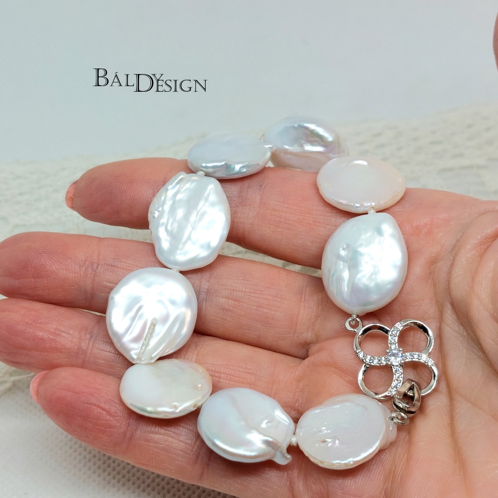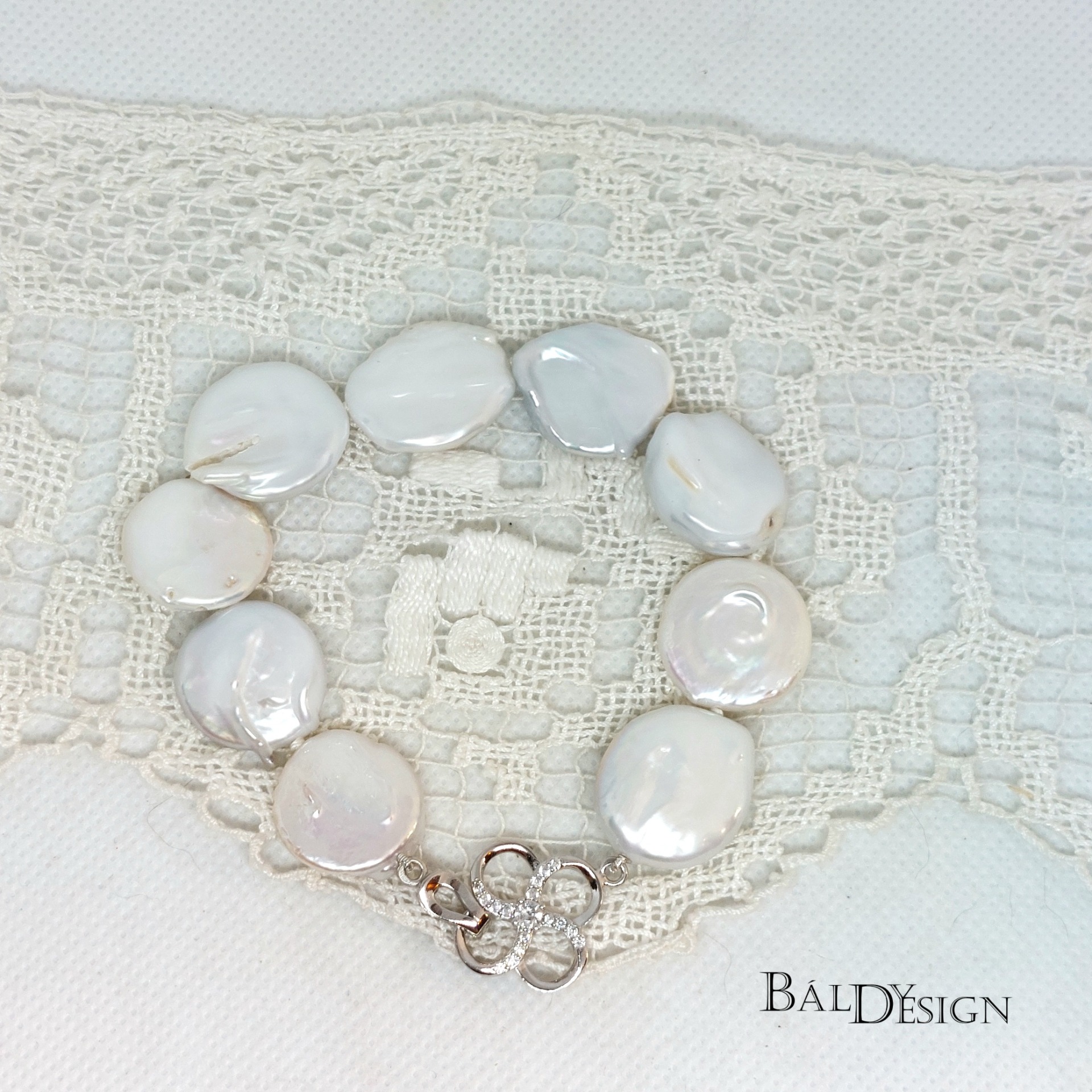 Különleges biwa tipusú édesvízi tenyésztett gyöngy karkötő. A nagy lencse alakú szemeknek szép színjátszó a fénye. Helyenként az édesvízi tenyésztett gyöngyre jellemző felületi hibákkal. Minden egyes gyöngy szem között csomó van, hogy ne koptassák egymást a szemek. Az édesvízi tenyésztett gyöngy karkötőnk egyszerre egyszerűséget és eleganciát sugározza. A gyöngyök különleges formája és felületi jellemzői a természetesség és az egyediség jegyében készültek. Bármilyen ruhával kombinálva tökéletes kiegészítővé válik, amely emeli a viselője stílusát és nőiességét.