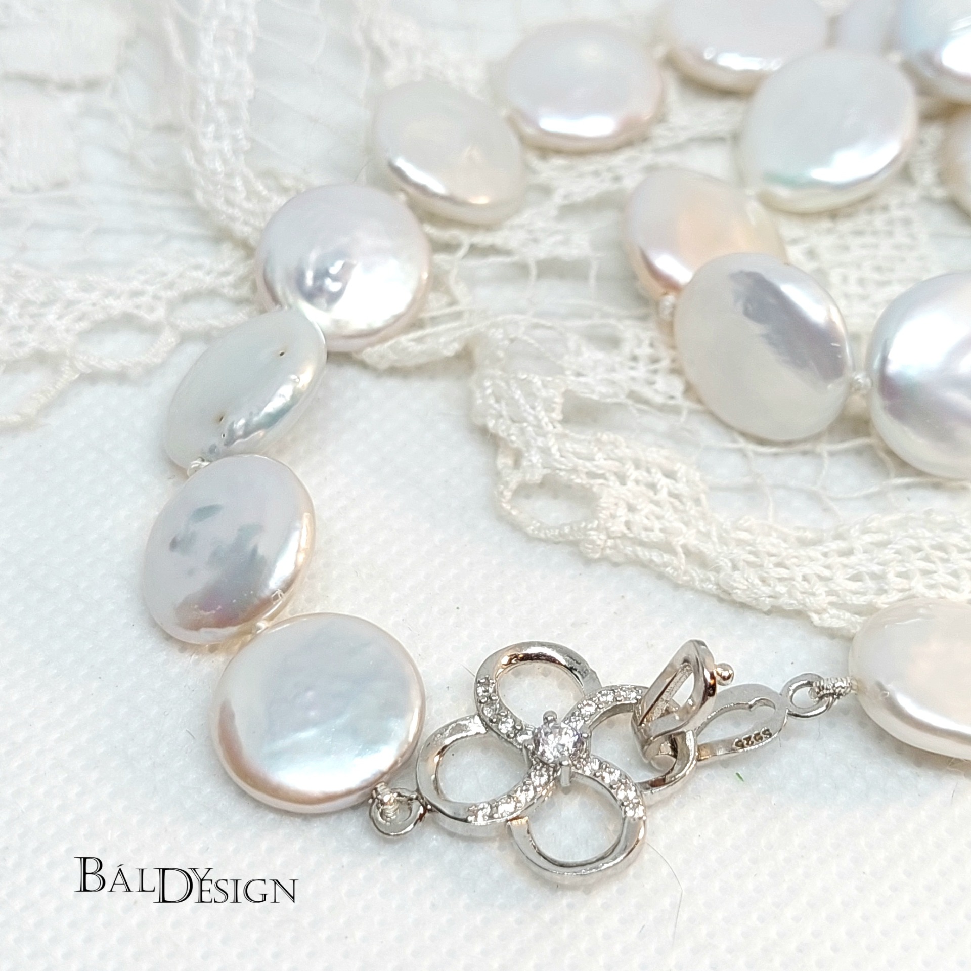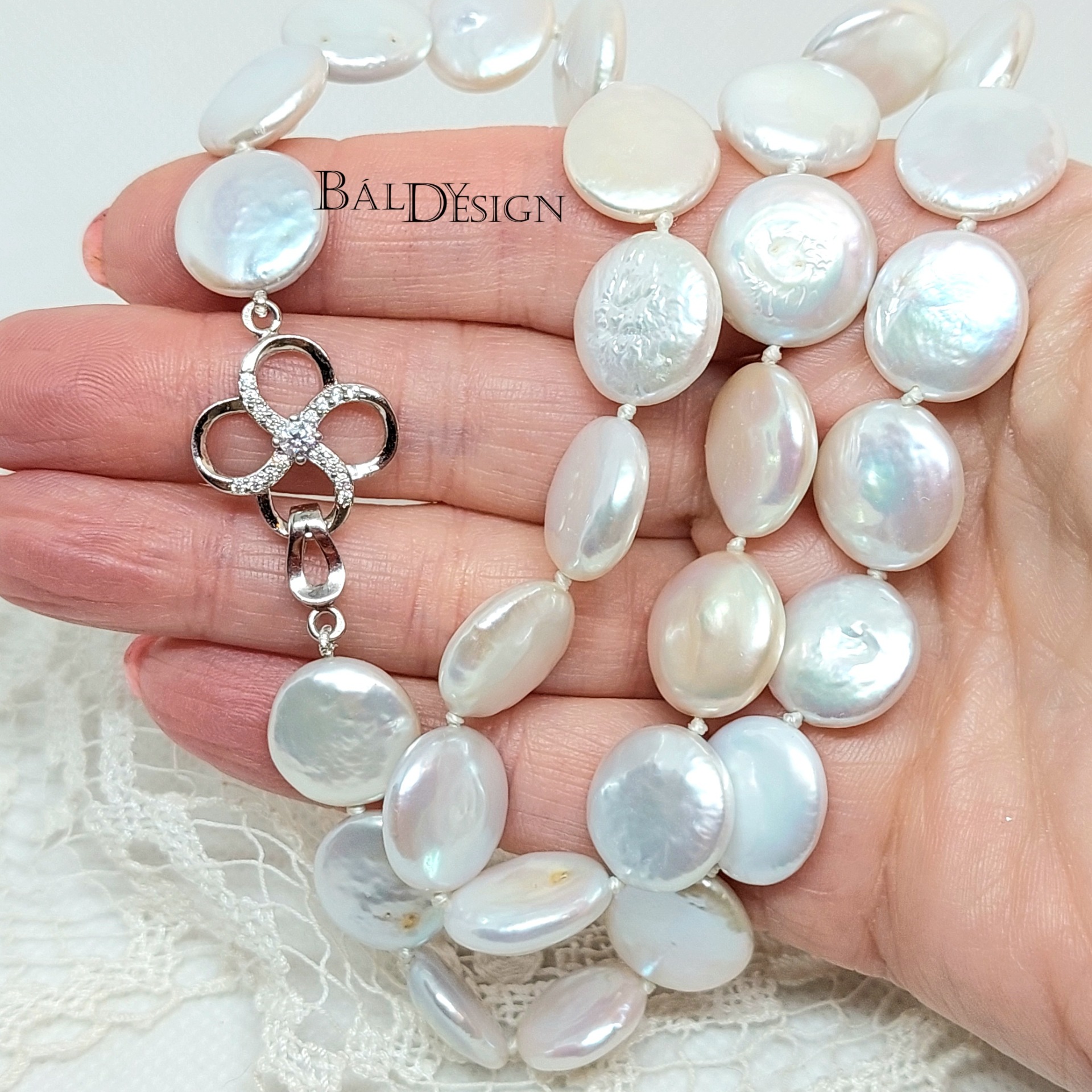 Különleges biwa tipusú édesvízi tenyésztett gyöngy nyaklánc. A nagy lencse alakú szemeknek szép színjátszó a fénye. Helyenként az édesvízi tenyésztett gyöngyre jellemző felületi hibákkal. Minden egyes gyöngy szem között csomó van, hogy ne koptassák egymást a szemek. Az édesvízi tenyésztett gyöngy nyakláncunk egyszerre egyszerűséget és eleganciát sugározza. A gyöngyök különleges formája és felületi jellemzői a természetesség és az egyediség jegyében készültek. Bármilyen ruhával kombinálva tökéletes kiegészítővé válik, amely emeli a viselője stílusát és nőiességét.